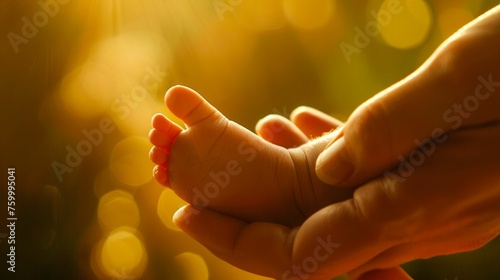 Newborn Baby Tiny Feet Cradled in Parent's Hands. Generative ai