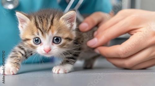 Newborn Kitten's First Steps, Vet Examines Development in Calm Clinic, Close-up Detail