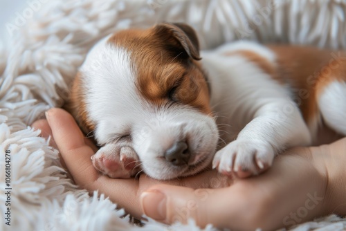 Newborn Puppy. Cute Jack Russel Terrier Dog Sleeping in Woman's Hands