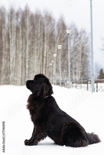 newfoundland dog sits on path