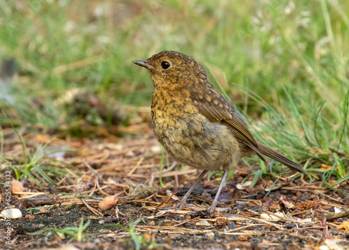 Newly fledged baby robin baby before the red breast develops as adult plumage