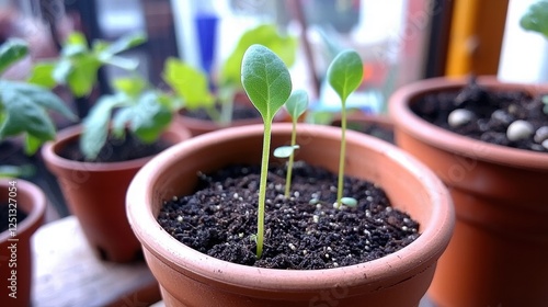 Newly Sprouted Seedlings Growing in Small Terracotta Pots on Bright Windowsill in Spring