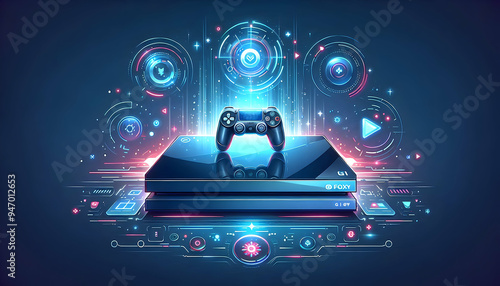 Next-Gen Gaming Experience: Flat Gaming Console with Holographic Controllers – Black Friday Concept | Vertical Shot with Dynamic Copy Space on White Background - Smart Business Vector Illustration