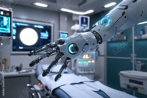 Next-gen robotic surgeon, highly detailed metal joints, advanced AI interface, futuristic medical setting, ultra-HD