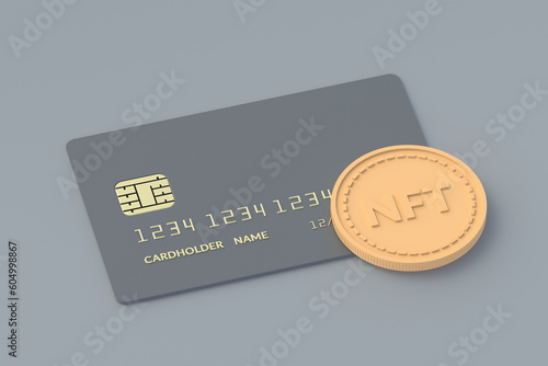NFT inscription on coin near credit card. Non-fungible token. Blockchain technology concept. Digital marketing. Modern art. Crypto artwork. 3d render