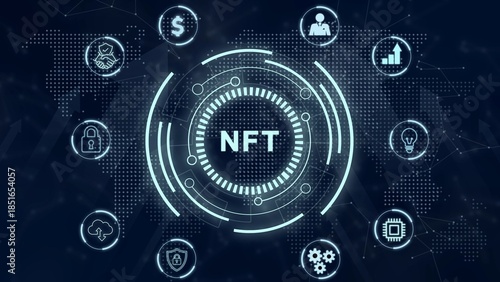 NFT Non-fungible token digital crypto on virtual screen. 3d illustration