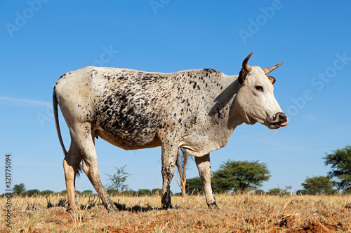 Nguni cow - indigenous cattle breed of South Africa - on rural farm.