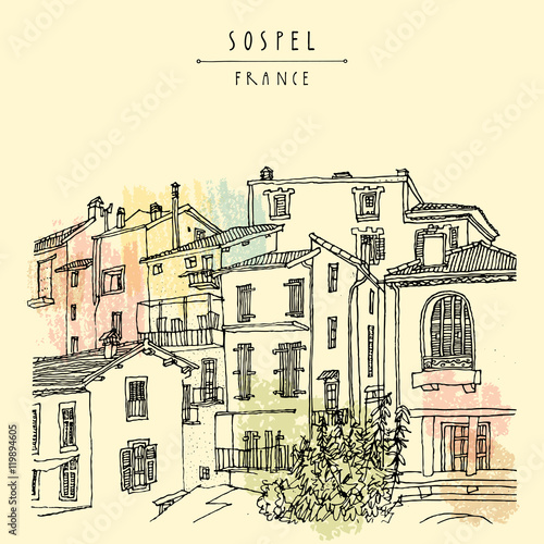Nice antique houses in Sospel, France, Europe. Cozy European town on French Riviera. Mediterranean chic. Hand drawing. Travel sketch. Vintage touristic postcard, poster or book illustration