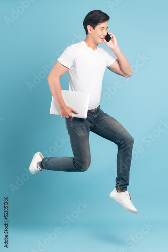 Nice asian guy in white t-shirt and jeans holding smartphone and laptop jumping isolated on blue background