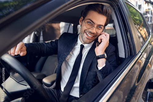 Nice business talk. Handsome young businessman talking on his smart phone and smiling while sitting on the front seat