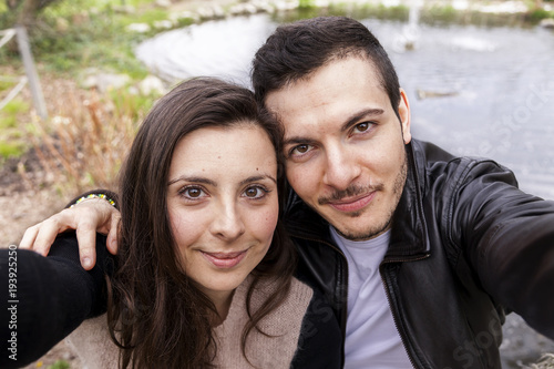 nice couple boyfriends in the park takes a selfie