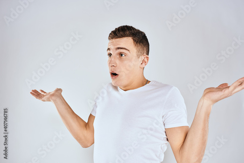 Nice man in a white t-shirt gestures with his hands emotions surprise studio