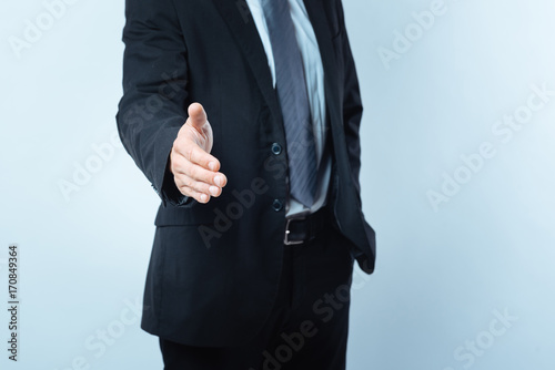 Nice pleasant man showing his hand