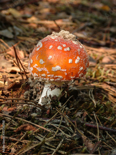 Nice red Amanita mushroom in autumn forest. One of the most toxic and poison mushrooms, not for eat.