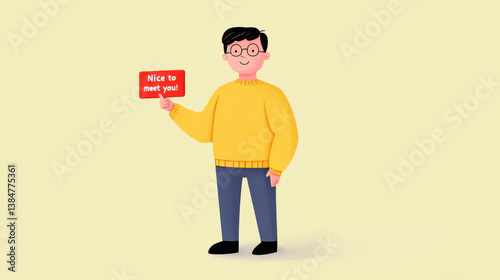 Nice to meet you, A character holding a sign that says "Nice to meet you" in a vibrant flat design.