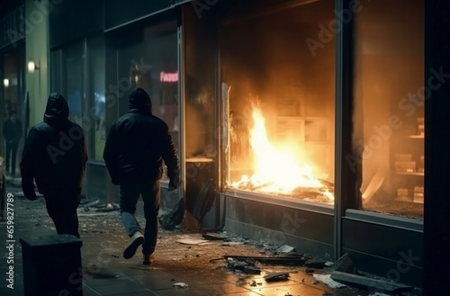 Night city riot fire smoke. Protest power. Generate AI
