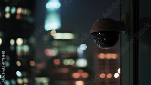 Night City Surveillance: A Security Camera Observes the Glittering Metropolis from a High-Rise Building