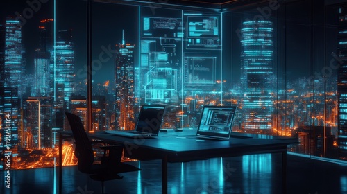 Night city view from futuristic office with data screens and laptops.