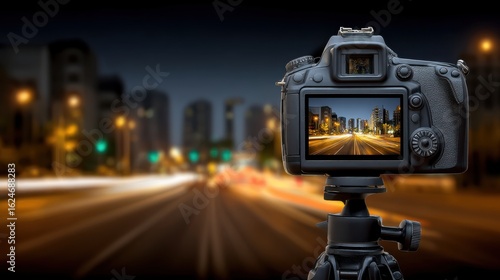 Night cityscape captured with a professional camera on a tripod showing illuminated buildings and blurred traffic lights