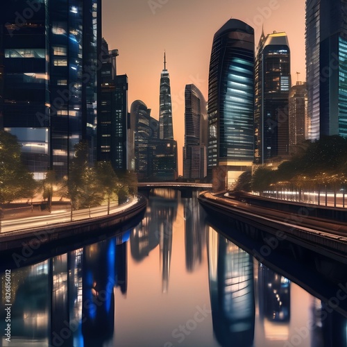 Night cityscape with illuminated skyscrapers and a river in the foreground5