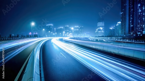 Night Cityscape with Light Trails: Modern Urban Transportation and Infrastructure at Twilight