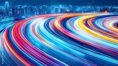 Night cityscape with vibrant light trails speeding through a street between tall skyscrapers.