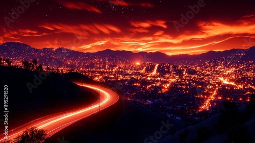 Night Cityscape with Winding Road - Breathtaking view of a city at night illuminated, with a winding road leading through the landscape under a fiery sunset sky.