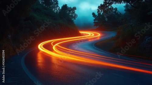 Night Drive: Winding Road, Light Trails, Misty Mountain