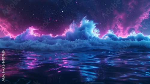 Night fantasy seascape with beautiful waves and foam. Night view of the ocean.