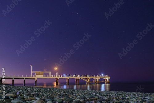 Night fishing on the pier, moon over the pier with fishing fisherman, starry sky background