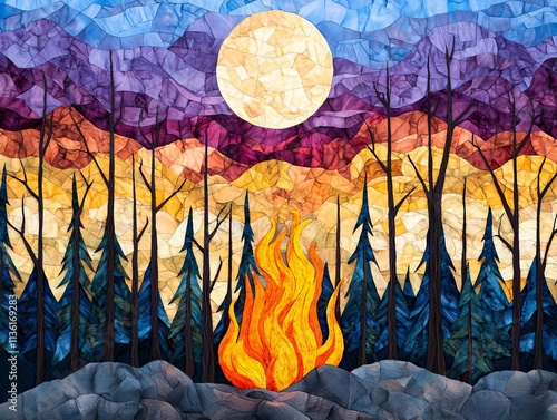 Night Forest Fire Mosaic Moonlit Campfire Trees Mountains