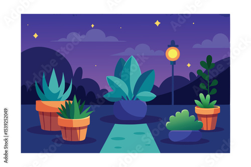 Night Garden Serene Potted Plants Under Starlit Sky
