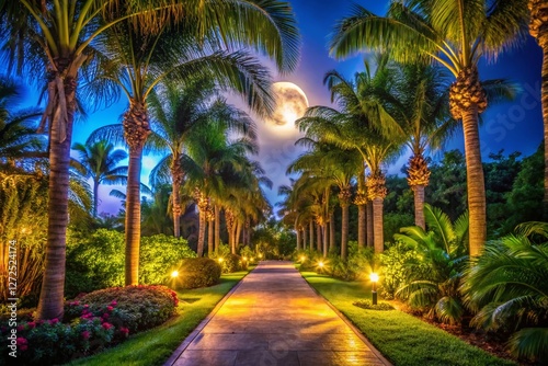 Night Garden Walkway: Palm Trees, Moonlight, Illuminated Path