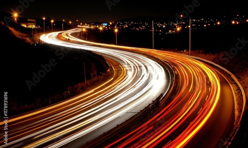 Night highway traffic light trails curve with city lights background, transportation concept.