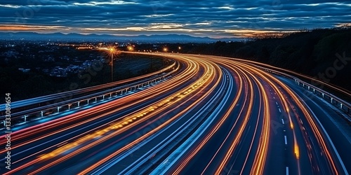 Night Highway Traffic Lights Trails Scenic Cityscape View red road cars blur dark blue fast speed