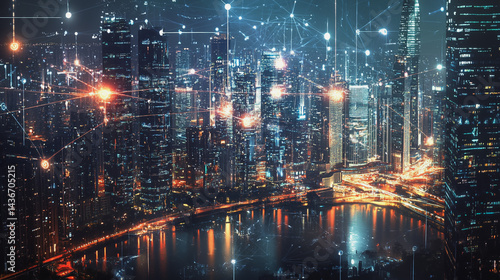 Night lights, a city of modern business and smart digital innovation with a network of interconnected rewards over the cityscape of the future smart wireless digital city and social media network that