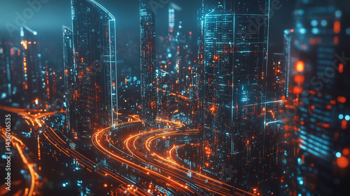 Night lights, a city of modern business and smart digital innovation with a network of interconnected rewards over the cityscape of the future smart wireless digital city and social media network that