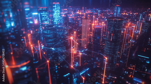 Night lights, a city of modern business and smart digital innovation with a network of interconnected rewards over the cityscape of the future smart wireless digital city and social media network that