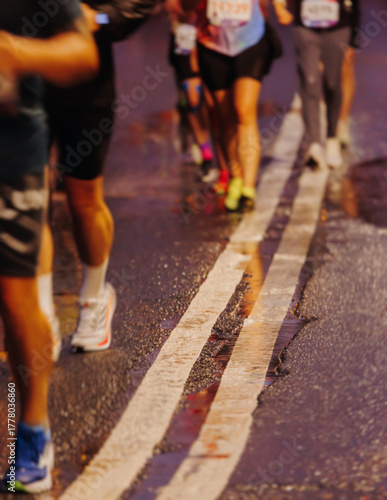 Night marathon runners crowd in the rain, sportsmen participants start running the half-marathon in the city streets with night lighting and illumination, group crowd of sportswomen joggers in motion