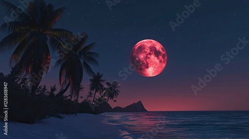 Night on the beach and palm trees, sunrise of the red moon and clear sky