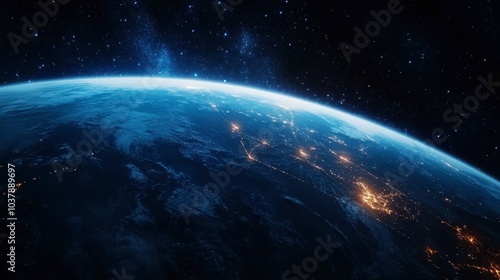 Night planet earth from space with light lines of communication and connection. Business and finance, concept. Global communications system and the World Wide Web. Technologies and communications.