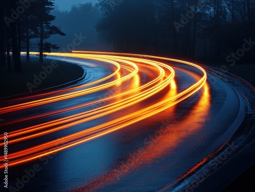 Night road curves, glowing light trails from vehicles reflect on wet asphalt. Dark trees frame scene