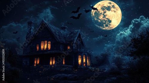 Night scene featuring a full moon, bats soaring above a haunted house with glowing windows, creating a chilling effect with copy space