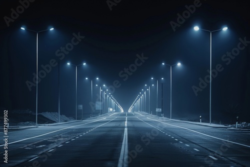 Night shot of street lamps illuminating a quiet road, emphasizing the safety and visibility aspects of road transport