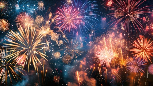 Night sky, fireworks burst in a dazzling display of colors and light.