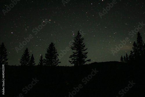 Night sky in the forest. Pine trees and stars at night. Mountain dark photography.