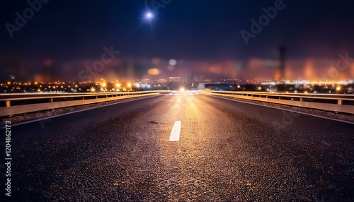 night traffic on the highway, close up photo of cracked road surface at night, building lights visible on the horizon