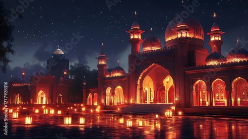 Night view of a Majestic Mosque illuminated with warm lights, reflecting on the calm water. A serene and peaceful atmosphere under the starry night sky.