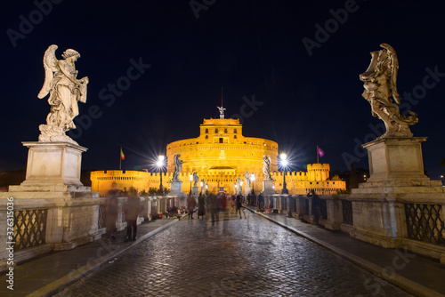 Night view of Castel Sant'Angelo and Ponte Sant'Angelo in Rome, Italy