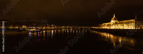 Night view of Lyon from the river bank Rhone, historical buildings, city center. Lyon France